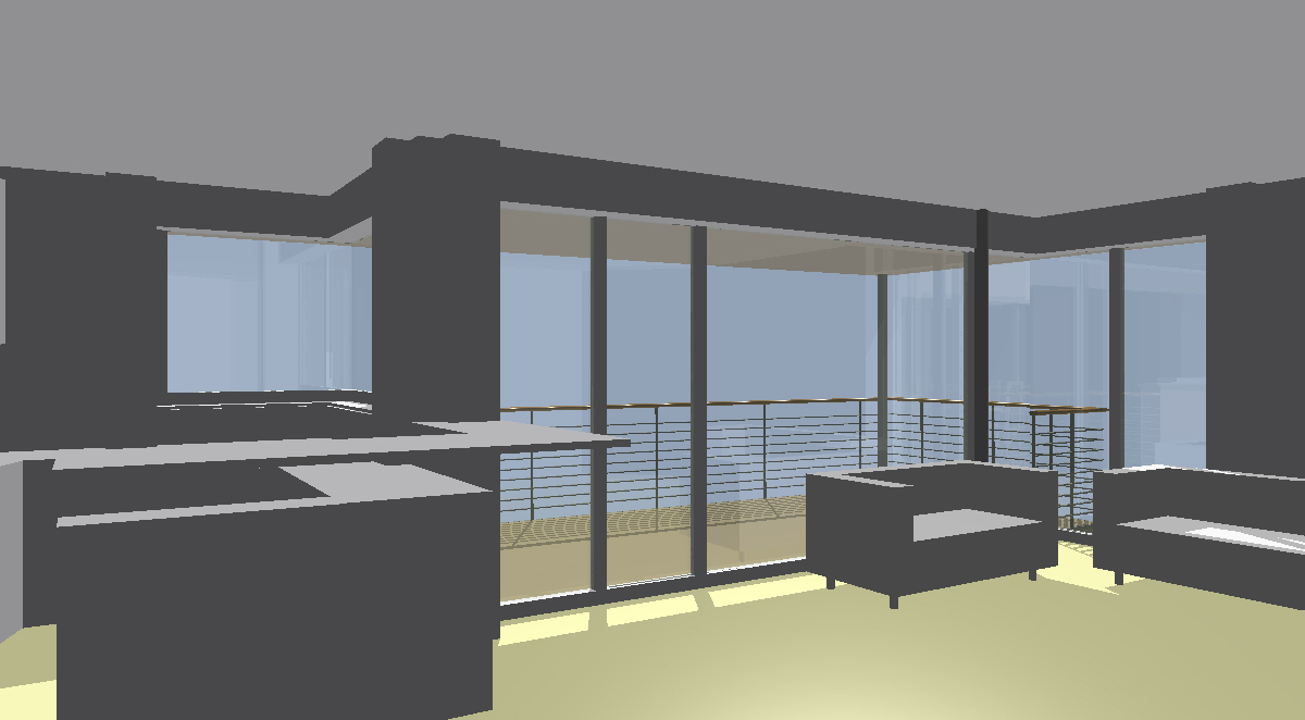 Typische Innenansicht / Wohnraum mit offenem Küchenbereich und raumhohen bzw. über Stehtischhöhe beginnenden Panoramafenstern jeweils über Eck zum 3 x 6 m Balkon